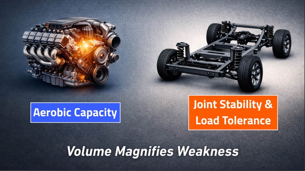 What happens when you layer hours of aerobic work on top of a body that hasn’t built basic strength or stability? What happens when you build a strong engine on a weak chassis?